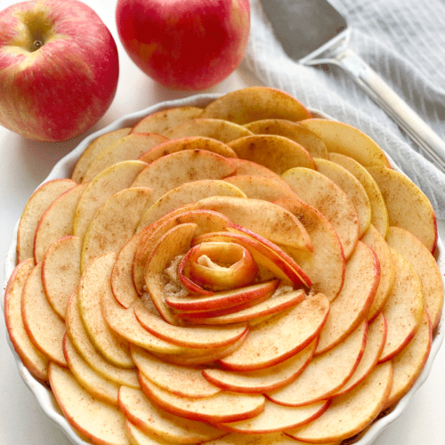To arrange the top into an apple rose, start at the edge of the pan (where the crust meets the pan) and layer apple slices 1/2 inch over each other. Continue making your way around the pan and then start the next row doing the same overlapping of the apples and continue until you get to the center. For the center pieces, you will need to cut them into smaller pieces to fit.