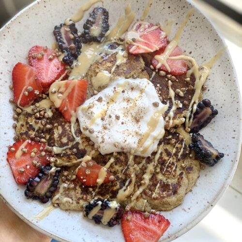 If you’re like me and go bananas for pancakes (pun intended) then you will love these. I’m always on the search for different variations of gluten free and dairy free pancakes. The best part about these pancakes is they are so quick to make, like less than 10 minutes from the time you start taking out the ingredients to the time you are eating your first pancake!