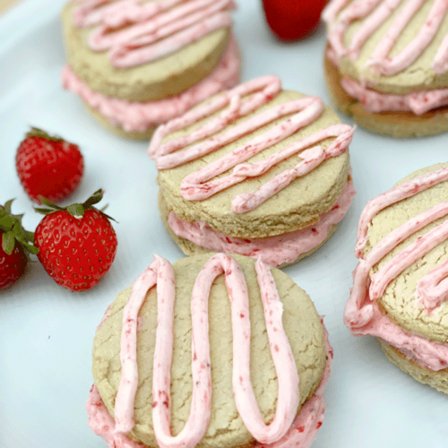 I recommend making the cookie batter first and while those bake, you can make the frosting that goes in between. The frosting is what really brings the whole cookie together! For the frosting, you will want to blend your strawberries in a food processor or high-speed blender until it becomes a smooth puree. You will then need to mix the puree in with the frosting. Be sure to follow my exact measurements for frosting to puree ratio if using the same Simple Mills frosting or else it could become too liquidy and start clumping.