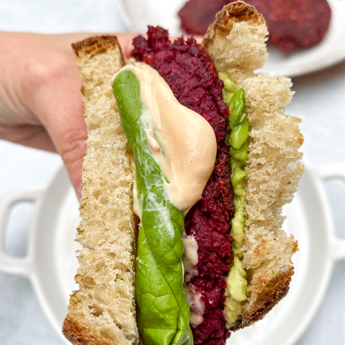 These veggie burgers are packed with protein, brown rice, black beans, and boiled beets for the ultimate vegetarian burger. These are easy to make once you cook the beets. Why beets? Beets are rich in fiber and full of nutrients like potassium, magnesium and vitamin C.Β Black beans are also rich in fiber and contain nutrients like calcium and iron. These burgers are a great alternative to many pre-made vegetarian burgers being sold at the grocery store and they will help to feed and fuel your body and are ready in an hour.