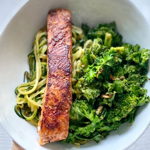 I am a big salmon eater, but it’s important to understand where your salmon is coming from because a lot of salmon sold in the US is farmed, which means fish are bred in pools rather than being caught in the wild. This can lead to less nutrients, high amounts of antibiotics fed to the fish to ward off disease, and less protein compared to wild caught. If you are going to eat farmed fish (which a lot of salmon is) it’s important to buy sustainable brands and understand the farming methods used. This is why I love getting my fish from Sizzlefish (use code GIRLSWHOEAT for 15% off their website). On top of offering five kinds of salmon with three being wild caught, their Atlantic Salmon, which is farmed-raised, has zero antibiotics and maintains the omega-3 fatty acids, which can be heavily reduced in farmed salmon.