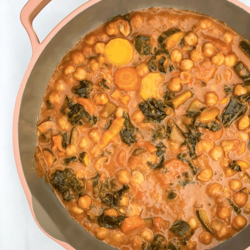 I recently discovered these curries from Brooklyn Delhi and have been obsessed ever since. They are packed with clean ingredients and loaded with spices. For this dish, you just add lots of your favorite vegetables, the Tomato Curry, and some coconut milk and water. I like to make these dishes when I discover that some veggies are on the verge of going bad or it’s time to clean out my refrigerator. For this recipe, I used zucchini, carrots, mushrooms, and kale, but the veggie possibilities are endless! I used chickpeas as my protein, but you could use lentils, shrimp, or any other protein you like instead