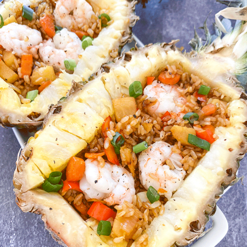 This is a super easy recipe ready in less than an hour and is hearty, tangy, and a bit sweet. You can even serve the dish in the pineapples for a fun spring meal! This recipe is made with shrimp for the protein, bell peppers, and fresh chunks of pineapple.