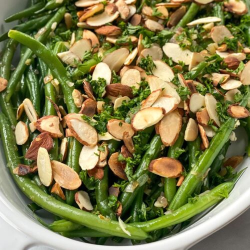 This side dish is a classic and so easy to make with only 8 simple ingredients. It’s ready in less than 30 minutes and blends green beans with crunchy almonds and caramelized shallots. It’s simple and only dressed with fresh parsley and lemon juice. It is gluten free, dairy free and vegan and is the perfect green side you need for the holidays.
