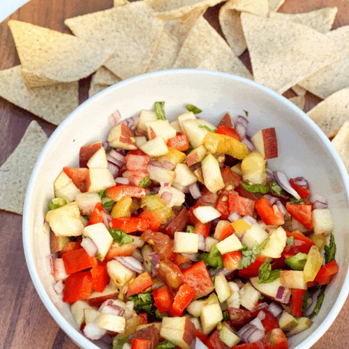 Tomatoes and peaches are in season now so this fresh salsa is the perfect dish to make that combines these two delicious ingredients. You can make this salsa a day in advance so the recipe has time to blend together or make it right before you want to enjoy it. I highly recommend eating it with tortilla chips or crackers or using it to top any fish dish to give your meal a seasonal taste.