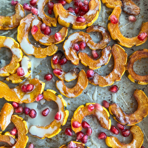 Delicata squash is one of my favorite fall seasonal vegetables. If you’re looking for a simple way to make then I recommend this simple roasted version that I make weekly whenever I can find them at my farmers market or grocery store. If you have never tried this type of squash, it has a thinner skin that is edible and is a bit on the sweeter side. After I roast my delicata slivers, I top it with a tahini drizzle and pomegranate seeds (also in season in the fall/winter) for the most flavorful combination. Enjoy this recipe as a side dish or top your salad with them for added veggies.